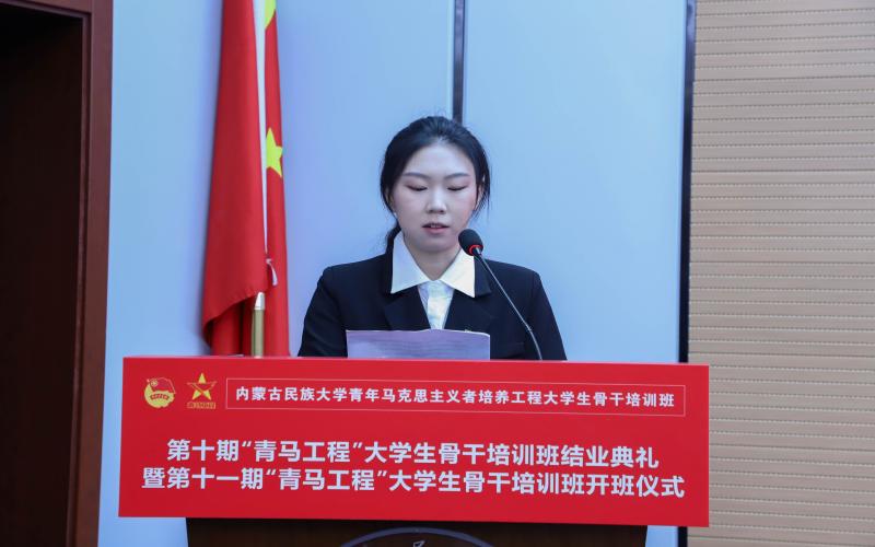 第十期“青马班”学员代表许佳乐在发言中分享了自己在理论学习、社会实践、志愿服务等方面的成长与收获,并表示在今后的学习工作中将继续发挥模范带头作用,带动更多青年大学生争做“强国一代”。鄂欣欣代表第十一期“青马班”学员发言,表示将以饱满的热情投入“青马班”的学习、实践等各环节中,不断提升政治素养与理论水平,努力成为一名坚定的青年马克思主义者。